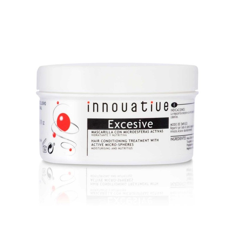 Mascarilla Excesive Innovative Rueber es una Mascarilla nutritiva con polipéptidos, rico en aminoácidos, aporta suavidad, elasticidad, vigor y brillo al cabello. Su pH medio ácido confiere a todo tipo de cabello protección de la estructura capilar externa acondicionándolo y eliminando la electricidad estática del mismo.
