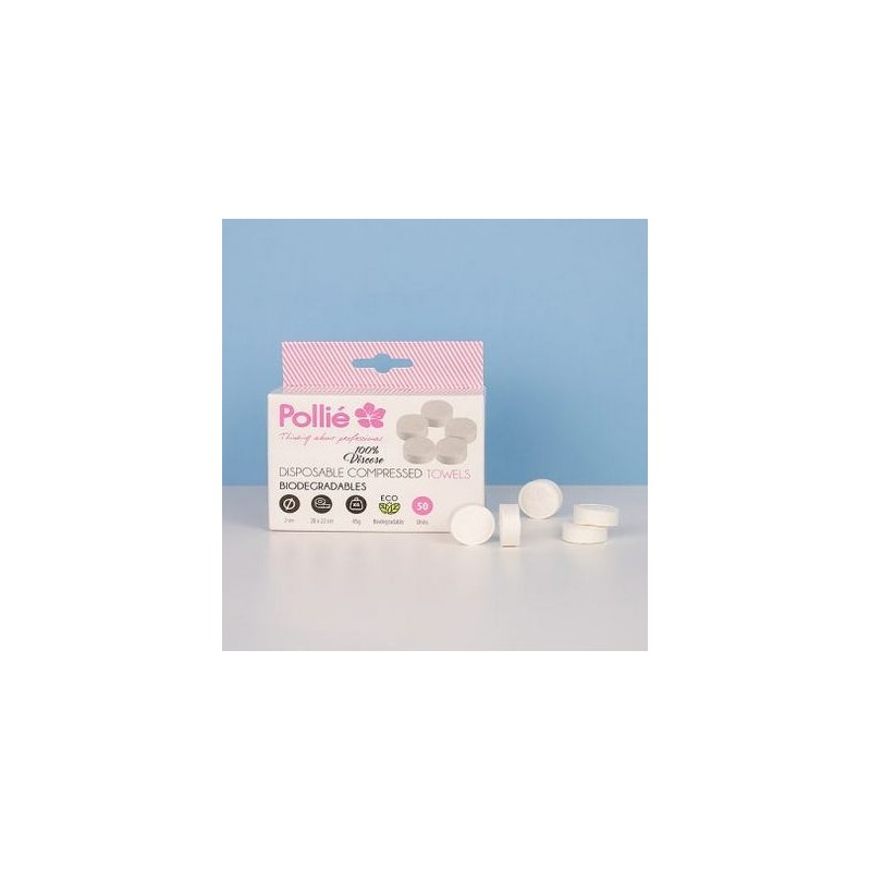 Toallas comprimidas desechables Pollié. Una vez expandidas, el tamaño de las toallas compactas es de 20 x 22 cm. Cada pastilla tiene un diámetro de 2 cm. y pesa 45 gr. Fabricadas en viscosa. Biodegradables.