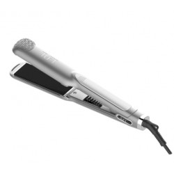 Somier de lamas fabricado en nanocerámica. Las aletas nanocerámicas emiten iones negativos que sellan la piel del cabello y le dan un aspecto más saludable y brillante. Sin fuerza de tracción innecesaria gracias a las aletas oscilantes que se adhieren perfectamente al cabello para un peinado impecable, más rápido y suave.