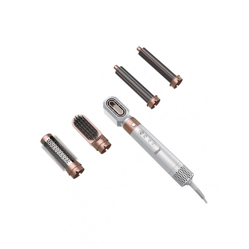 Secador Penta, incluye 5 accesorios intercambiables diferentes para que consigas el mejor resultado en cada momento. Podrás lograr diferentes acabados gracias a su boquilla, su cepillo redondo, su cepillo alisador y sus dos barriles rizadores. Desde ondas hasta un cabello mucho mas liso completo. Penta Posee una temperatura máxima de 90ºC y un botón de aire frío para acabar los peinados con un brillo mucho mas intenso y duradero. Facil manejo en todos los resultados que puedes conseguir con Pentay sus accesorios