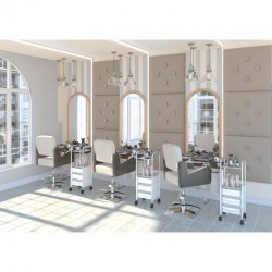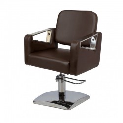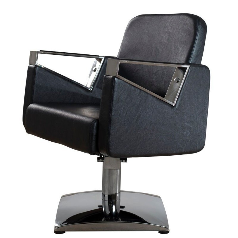 Silla de peluquería Cuadro. El detalle llamativo de esta silla son los apoyabrazos con elementos metálicos, que hacen una vista de este modelo cuadrado mas ligero. También los apoyabrazos pueden complementar detalles en piel que se sujetan con velcro.
