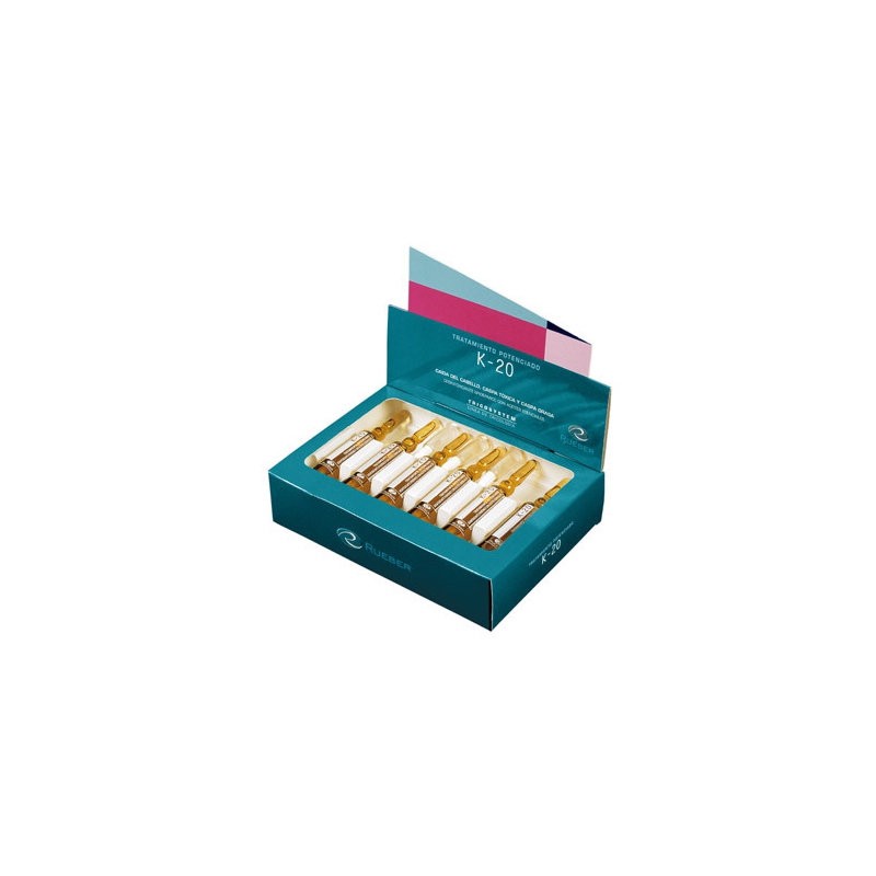 Es un tratamiento de efecto inmediato sobre los procesos de descamación (anti-caspa y antitoxíniana). Rueber Tricosystem K-20 Potenciador Anti Toxinas 12 Viales se presenta en formato envase con 12 viales de 10 ml.
